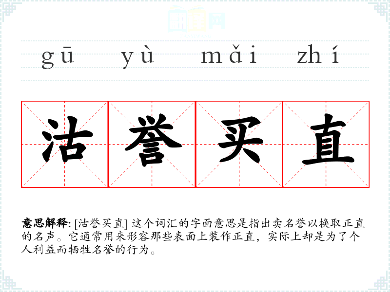 [沽誉买直] 这个词汇的字面意思是指出卖名誉以换取正直的名声。它通常用来形容那些表面上装作正直,实际上却是为了个人利益而牺牲名誉的行为。