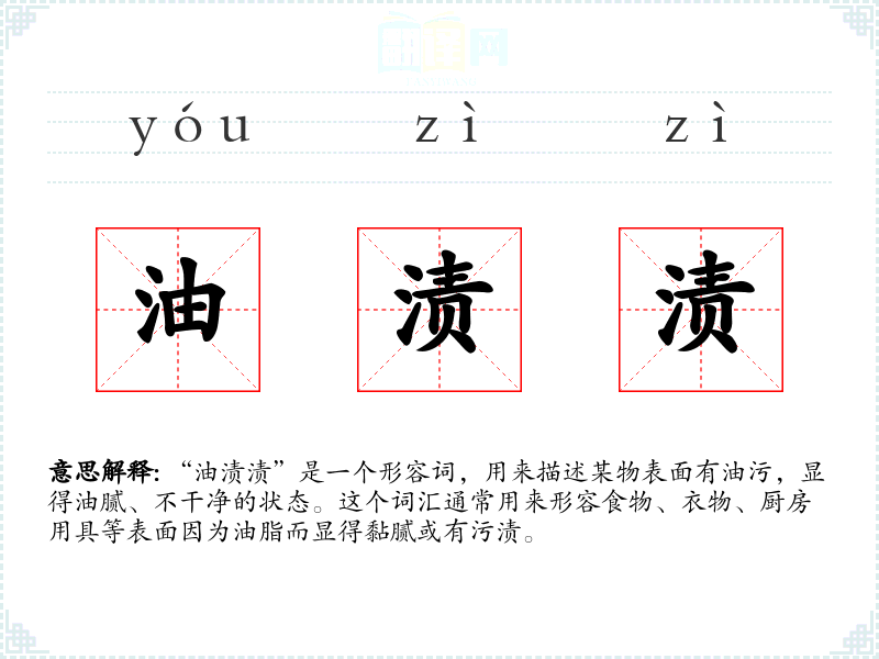 “油渍渍”是一个形容词,用来描述某物表面有油污,显得油腻、不干净的状态。这个词汇通常用来形容食物、衣物、厨房用具等表面因为油脂而显得黏腻或有污渍。