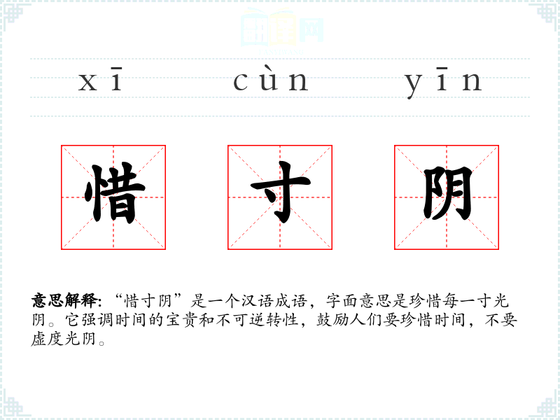 “惜寸阴”是一个汉语成语,字面意思是珍惜每一寸光阴。它强调时间的宝贵和不可逆转性,鼓励人们要珍惜时间,不要虚度光阴。