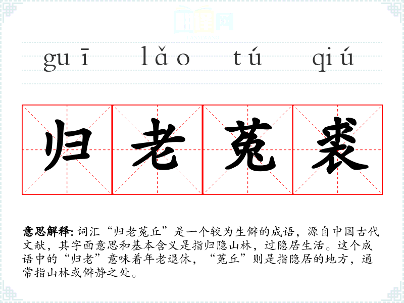 词汇“归老菟丘”是一个较为生僻的成语,源自**古代文献,其字面意思和基本含义是指归隐山林,过隐居生活。这个成语中的“归老”意味着年老退休,“菟丘”则是指隐居的地方,通常指山林或僻静之处。
