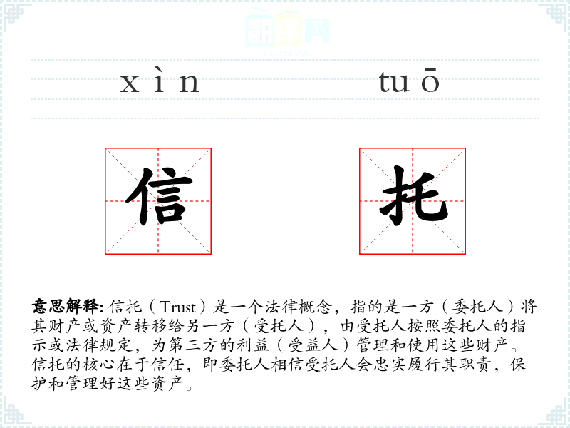 - 专业领域:在法律和金融领域,“信托”是一个专业术语,涉及复杂的法律文件和资产管理。