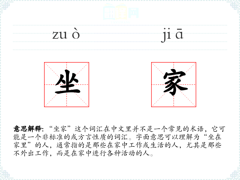 “坐家”这个词汇在中文里并不是一个常见的术语,它可能是一个非标准的或方言性质的词汇。字面意思可以理解为“坐在家里”的人,通常指的是那些在家中工作或生活的人,尤其是那些不外出工作,而是在家中进行各种活动的人。