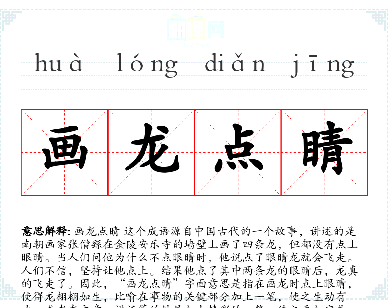 画龙点睛 这个成语源自**古代的一个故事,讲述的是南朝画家张僧繇在金陵安乐寺的墙壁上画了四条龙,但都没有点上眼睛。当人们问他为什么不点眼睛时,他说点了眼睛龙就会飞走。人们不信,坚持让他点上。结果他点了其中两条龙的眼睛后,龙真的飞走了。因此,“画龙点睛”字面意思是指在画龙时点上眼睛,使得龙栩栩如生,比喻在事物的关键部分加上一笔,使之生动有力,或者在文章、讲话等的结尾加上精彩的一笔,使之更加完美。