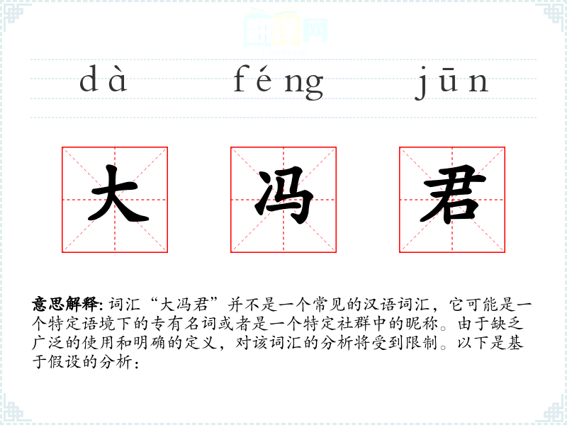 词汇“大冯君”并不是一个常见的汉语词汇,它可能是一个特定语境下的专有名词或者是一个特定社群中的昵称。由于缺乏广泛的使用和明确的定义,对该词汇的分析将受到限制。以下是基于假设的分析: