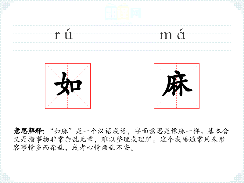 “如麻”是一个汉语成语,字面意思是像麻一样。基本含义是指事物非常杂乱无章,难以整理或理解。这个成语通常用来形容事情多而杂乱,或者心情烦乱不安。