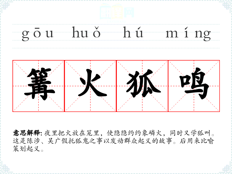 象磷火,同时又学狐叫。这是陈涉、吴广假托狐鬼之事以发动群众起义的故事。后用来比喻策划起义。