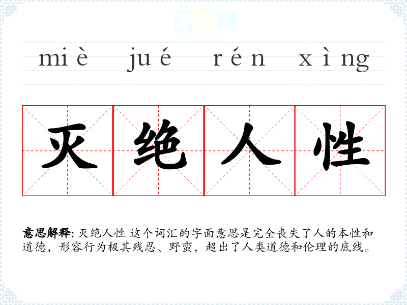 灭绝人性 这个词汇的字面意思是完全丧失了人的本性和道德,形容行为极其残忍、野蛮,超出了人类道德和伦理的底线。