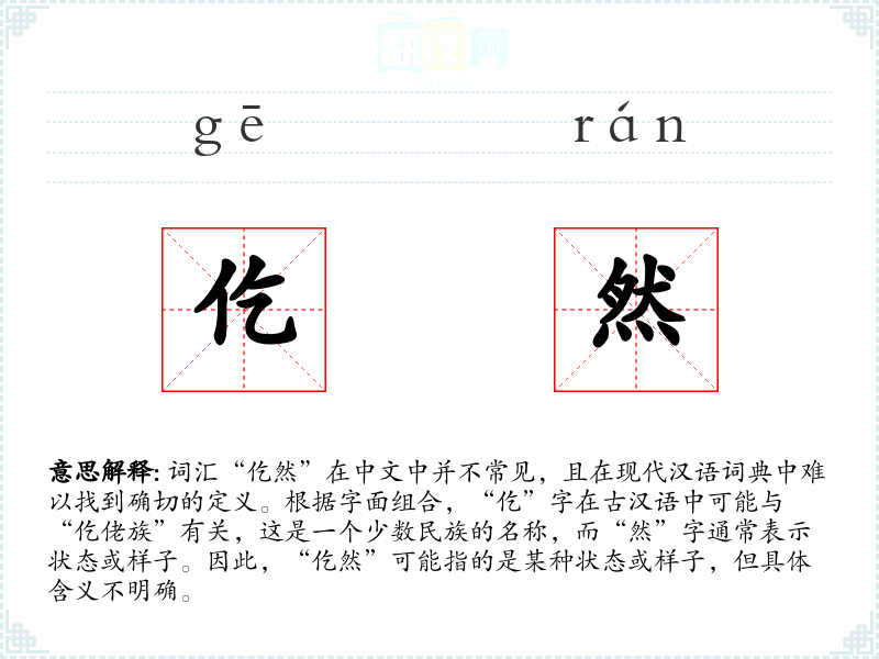 词汇“仡然”在中文中并不常见,且在现代汉语词典中难以找到确切的定义。根据字面组合,“仡”字在古汉语中可能与“仡佬族”有关,这是一个少数民族的名称,而“然”字通常表示状态或样子。因此,“仡然”可能指的是某种状态或样子,但具体含义不明确。