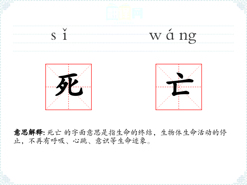 死亡 的字面意思是指生命的终结,生物体生命活动的停止,不再有呼吸、心跳、意识等生命迹象。