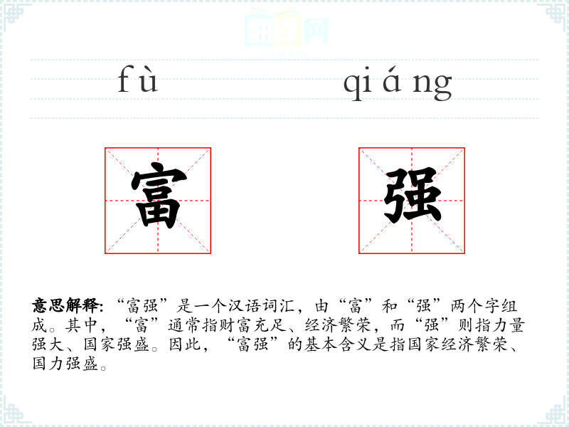 - 文学语境:在文学作品中,“富强”常用来描绘理想中的国家或社会状态,如“这个国家正朝着富强的方向稳步前进”。