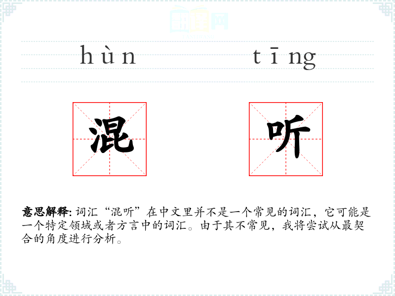 词汇“混听”在中文里并不是一个常见的词汇,它可能是一个特定领域或者方言中的词汇。由于其不常见,我将尝试从最契合的角度进行分析。