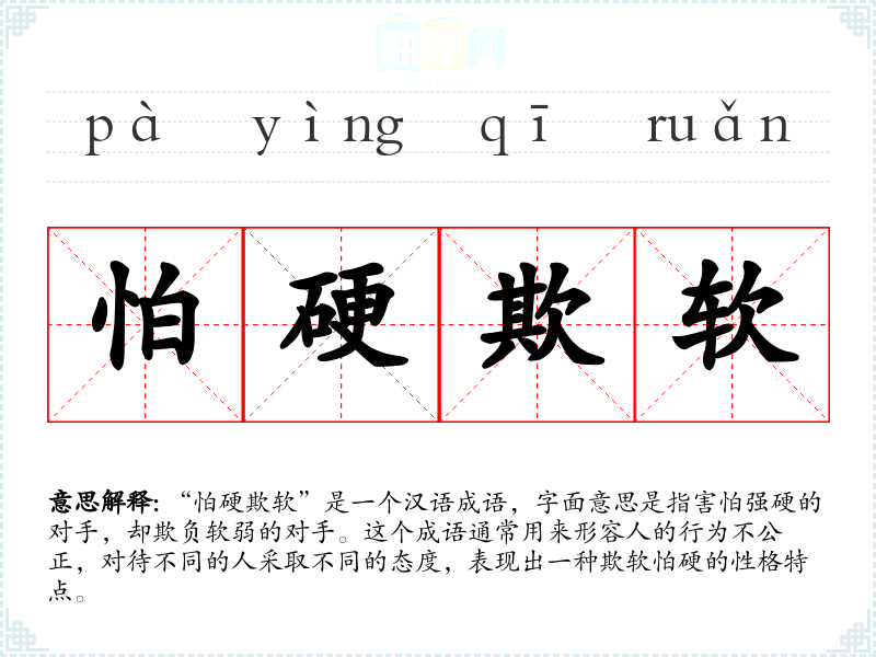 “怕硬欺软”是一个汉语成语,字面意思是指害怕强硬的对手,却欺负软弱的对手。这个成语通常用来形容人的行为不公正,对待不同的人采取不同的态度,表现出一种欺软怕硬的性格特点。