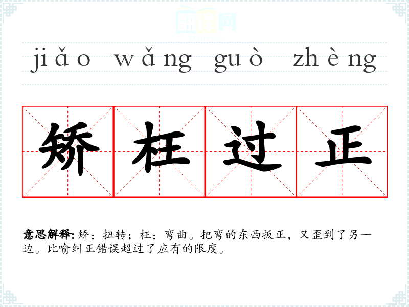 矫:扭转;枉:弯曲。把弯的东西扳正,又歪到了另一边。比喻纠正错误超过了应有的限度。