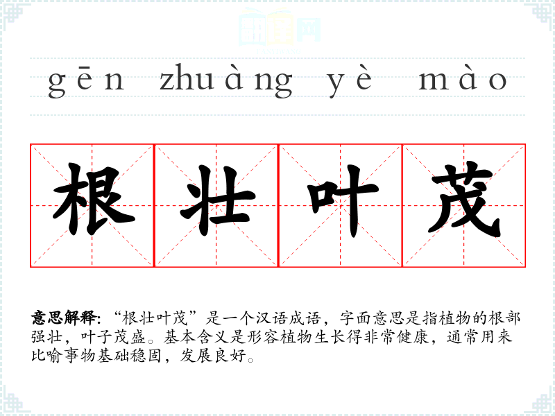 “根壮叶茂”是一个汉语成语,字面意思是指植物的根部强壮,叶子茂盛。基本含义是形容植物生长得非常健康,通常用来比喻事物基础稳固,发展良好。