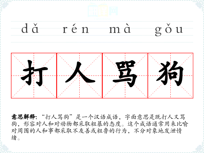 “打人骂狗”是一个汉语成语,字面意思是既打人又骂狗,形容对人和对动物都采取粗暴的态度。这个成语通常用来比喻对周围的人和事都采取不友善或粗鲁的行为,不分对象地发泄情绪。