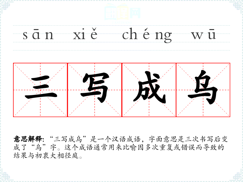 “三写成乌”是一个汉语成语,字面意思是三次书写后变成了“乌”字。这个成语通常用来比喻因多次重复或错误而导致的结果与初衷大相径庭。