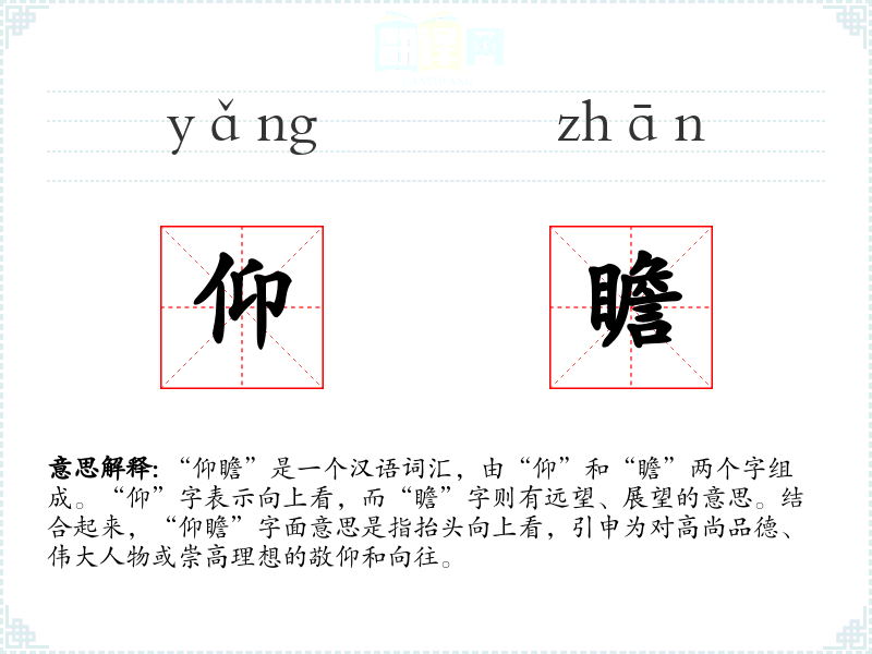 在英语中,“仰瞻”可以对应为“look up to”或“admire”,但这些词汇在表达上可能没有“仰瞻”那么强烈的敬仰和向往的意味。