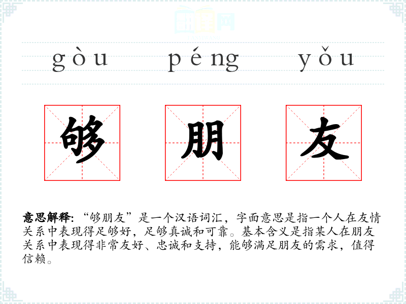 “够朋友”是一个汉语词汇,字面意思是指一个人在友情关系中表现得足够好,足够真诚和可靠。基本含义是指某人在朋友关系中表现得非常友好、忠诚和支持,能够满足朋友的需求,值得信赖。