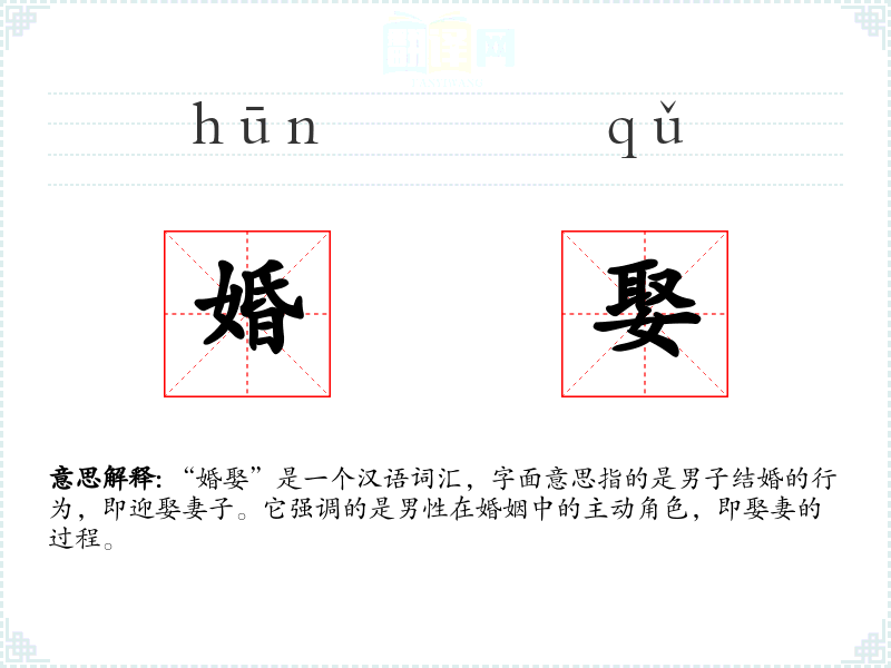 在传统文化中,“婚娶”是一个重要的社会,涉及家族的荣誉和未来的联姻。它反映了传统社会中男性的主导地位和家族的重要性。