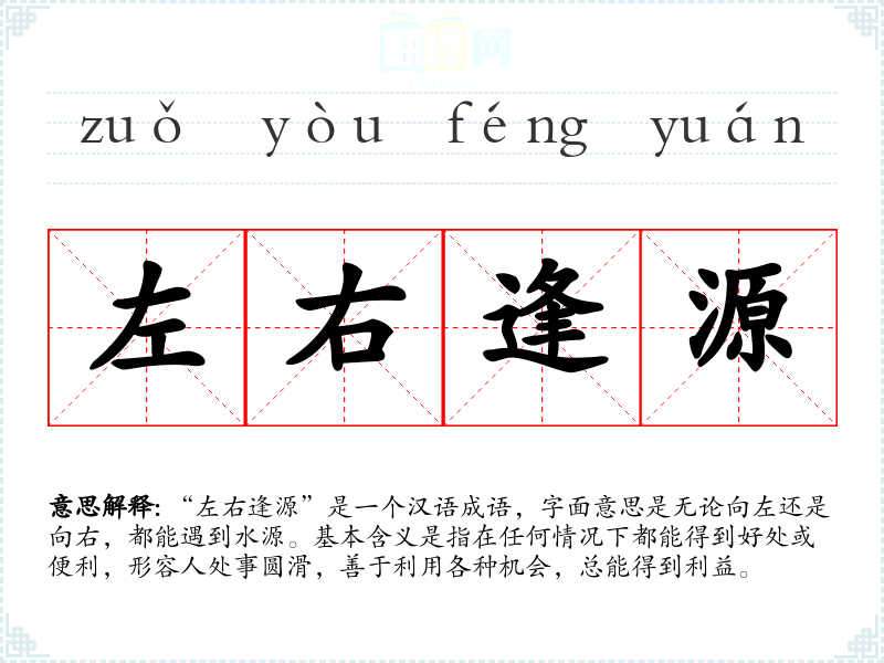“左右逢源”是一个汉语成语,字面意思是无论向左还是向右,都能遇到水源。基本含义是指在任何情况下都能得到好处或便利,形容人处事圆滑,善于利用各种机会,总能得到利益。