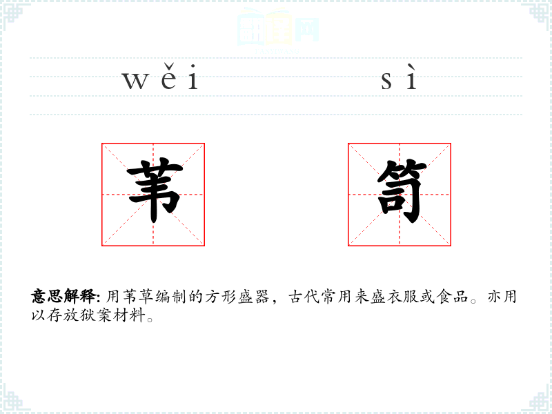 用苇草编制的方形盛器,古代常用来盛衣服或食品。亦用以存放狱案材料。