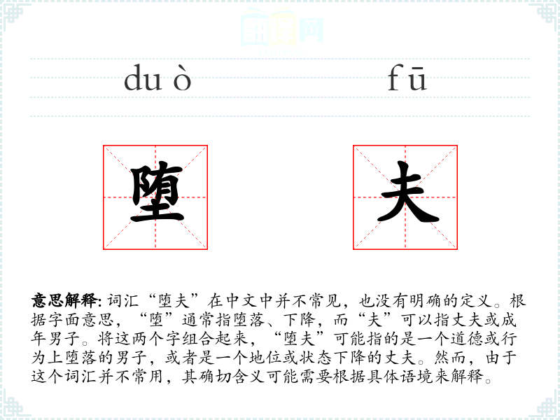 词汇“堕夫”在中文中并不常见,也没有明确的定义。根据字面意思,“堕”通常指堕落、下降,而“夫”可以指丈夫或成年男子。将这两个字组合起来,“堕夫”可能指的是一个道德或行为上堕落的男子,或者是一个地位或状态下降的丈夫。然而,由于这个词汇并不常用,其确切含义可能需要根据具体语境来解释。