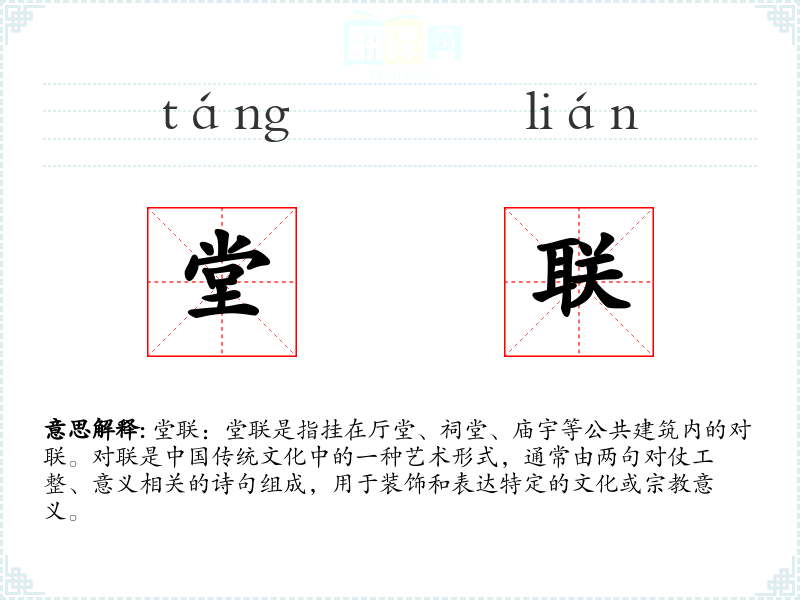 堂联:堂联是指挂在厅堂、祠堂、庙宇等公共建筑内的对联。对联是传统文化中的一种艺术形式,通常由两句对仗工整、意义相关的诗句组成,用于装饰和表达特定的文化或意义。