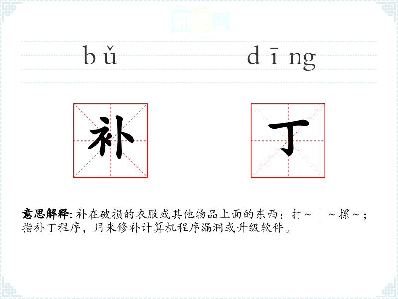 补在破损的衣服或其他物品上面的东西:打~|~摞~;指补丁程序,用来修补计算机程序漏洞或升级软件。