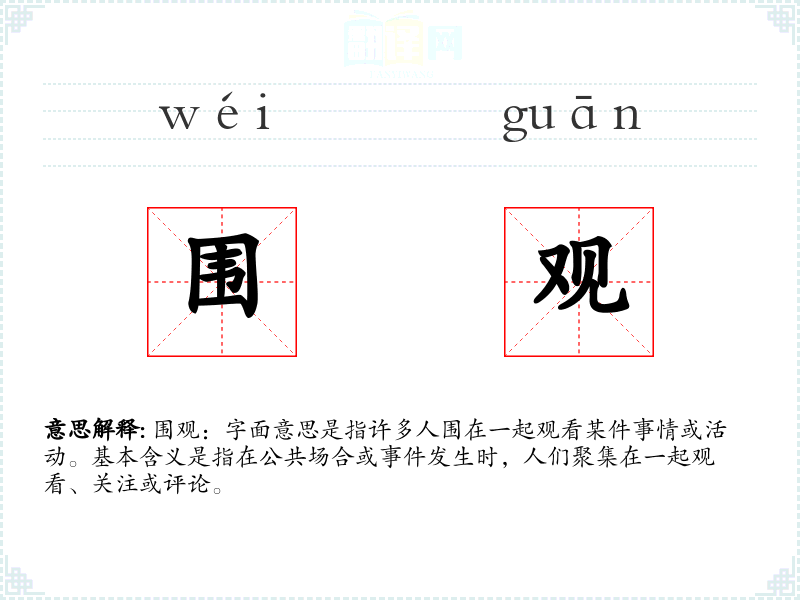 - 文学:在文学作品中,“围观”常常用来描绘人群的聚集和对**的关注,如“人群围观的场景”。