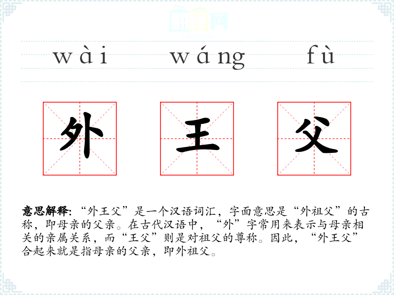 “外王父”是一个汉语词汇,字面意思是“外祖父”的古称,即母亲的父亲。在古代汉语中,“外”字常用来表示与母亲相关的亲属关系,而“王父”则是对祖父的尊称。因此,“外王父”合起来就是指母亲的父亲,即外祖父。
