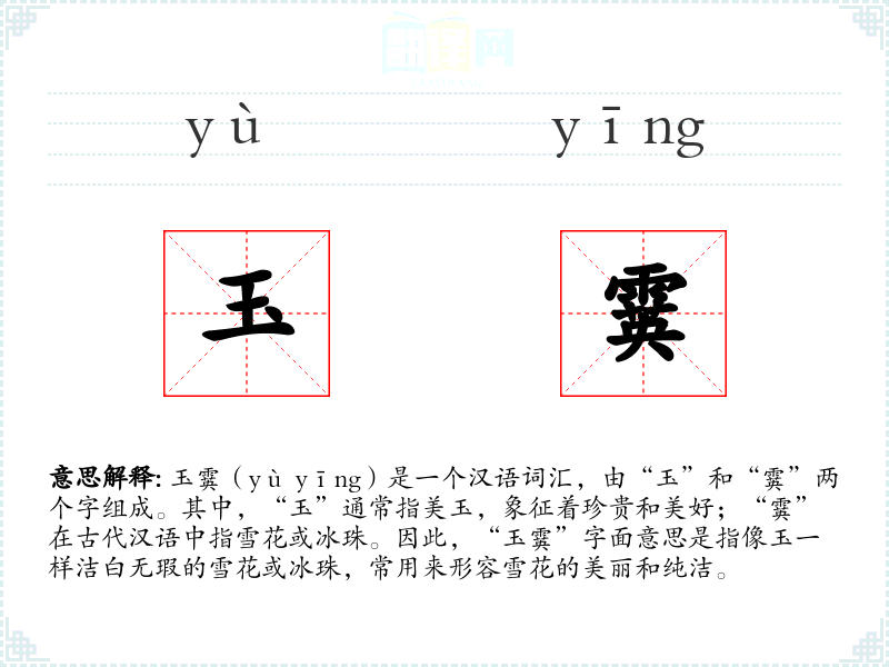 玉霙(yù yīng)是一个汉语词汇,由“玉”和“霙”两个字组成。其中,“玉”通常指美玉,象征着珍贵和美好;“霙”在古代汉语中指雪花或冰珠。因此,“玉霙”字面意思是指像玉一样洁白无瑕的雪花或冰珠,常用来形容雪花的美丽和纯洁。