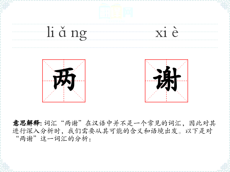 词汇“两谢”在汉语中并不是一个常见的词汇,因此对其进行深入分析时,我们需要从其可能的含义和语境出发。以下是对“两谢”这一词汇的分析: