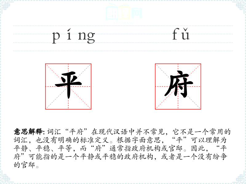 词汇“平府”在现代汉语中并不常见,它不是一个常用的词汇,也没有明确的标准定义。根据字面意思,“平”可以理解为平静、平稳、平等,而“府”通常指政府机构或官邸。因此,“平府”可能指的是一个平静或平稳的政府机构,或者是一个没有纷争的官邸。