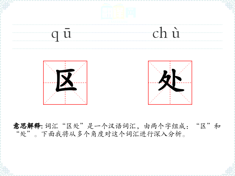 词汇“区处”是一个汉语词汇,由两个字组成:“区”和“处”。下面我将从多个角度对这个词汇进行深入分析。