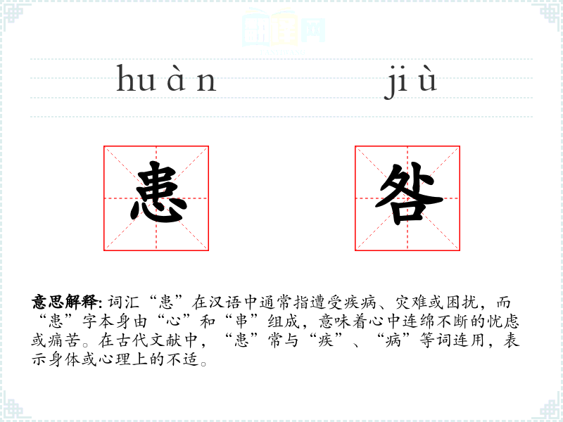 - 理解:“患”是一个表达不幸和疾病的词汇,它在不同语境中有不同的用法和含义。
