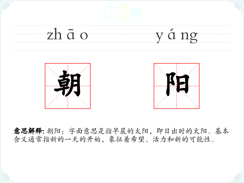 朝阳:字面意思是指早晨的太阳,即日出时的太阳。基本含义通常指新的一天的开始,象征着希望、活力和新的可能性。