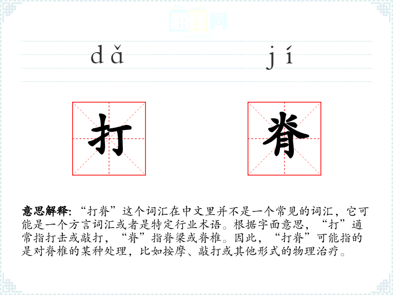 由于“打脊”不是一个标准汉语词汇,它在不同语境下的使用可能非常有限。在某些方言或特定行业(如中医、按摩行业)中,它可能被用来描述一种针对脊椎的治疗方法。