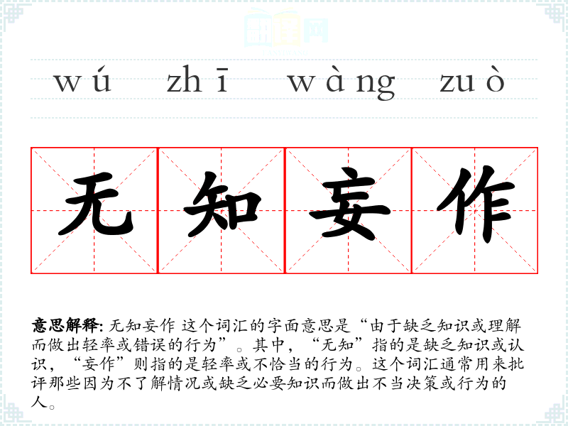 无知妄作 这个词汇的字面意思是“由于缺乏知识或理解而做出轻率或错误的行为”。其中,“无知”指的是缺乏知识或认识,“妄作”则指的是轻率或不恰当的行为。这个词汇通常用来批评那些因为不了解情况或缺乏必要知识而做出不当决策或行为的人。