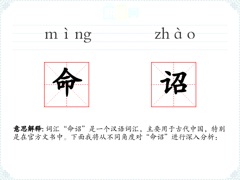 “命诏”字面意思是指**或君主下达的命令或诏书。它是一种正式的、具有法律效力的官方文件,用于传达君主的意志和决策。