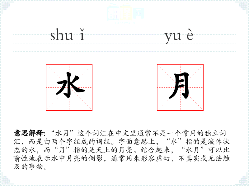 在文学作品中,“水月”常用来形容美丽但虚幻的景象,如“水月镜花”比喻虚幻的景象或无法实现的事物。在口语中,这个词汇可能不常用,但在某些特定的语境下,如讨论梦境、幻想或不切实际的愿望时,可能会用到。