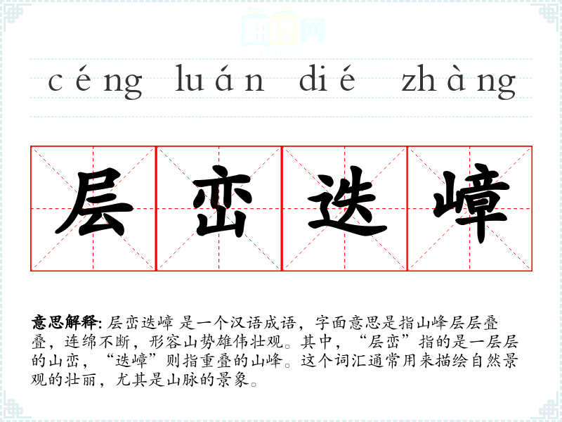 层峦迭嶂 是一个汉语成语,字面意思是指山峰层层叠叠,连绵不断,形容山势雄伟壮观。其中,“层峦”指的是一层层的山峦,“迭嶂”则指重叠的山峰。这个词汇通常用来描绘自然景观的壮丽,尤其是山脉的景象。