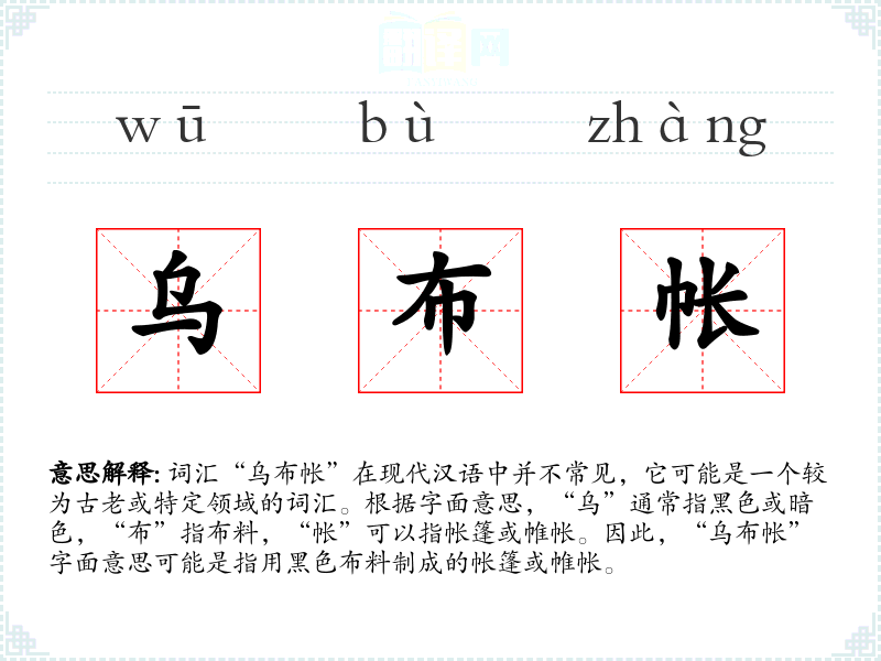 词汇“乌布帐”在现代汉语中并不常见,它可能是一个较为古老或特定领域的词汇。根据字面意思,“乌”通常指黑色或暗色,“布”指布料,“帐”可以指帐篷或帷帐。因此,“乌布帐”字面意思可能是指用黑色布料制成的帐篷或帷帐。