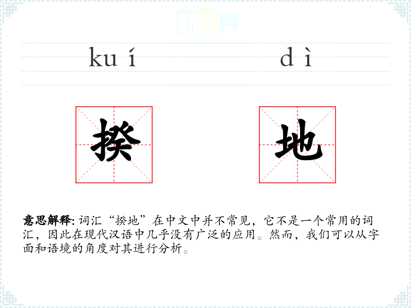 “揆地”是一个不常用的词汇,主要与土地测量和管理相关。在现代汉语中,它的使用非常有限,但在古代文献中可能会有所体现。在学*汉语时,了解这样的词汇可以帮助我们更好地理解汉语的历史和文化背景。