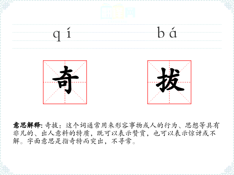 奇拔:这个词通常用来形容事物或人的行为、思想等具有非凡的、出人意料的特质,既可以表示赞赏,也可以表示惊讶或不解。字面意思是指奇特而突出,不寻常。