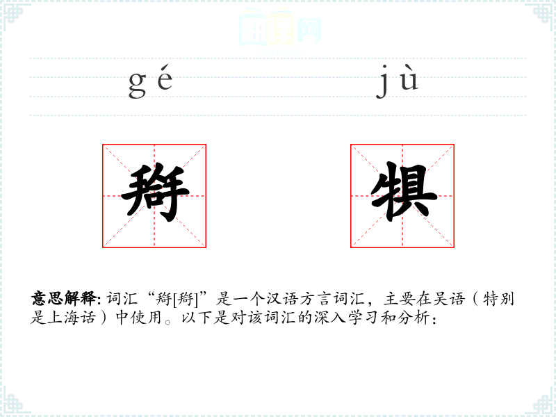 词汇“搿[搿]”是一个汉语方言词汇,主要在吴语(特别是上海话)中使用。以下是对该词汇的深入学习和分析: