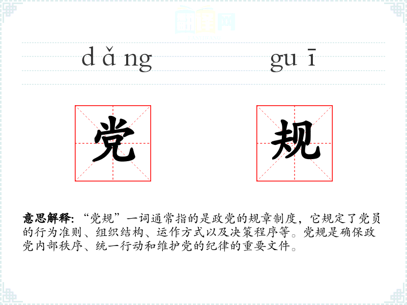 - 反义词:无(由于“党规”特指政党的规章制度,通常没有直接的反义词)