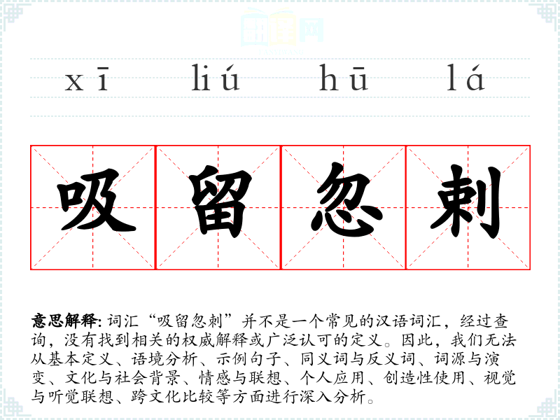 综上所述,由于“吸留忽刺”不是一个已知的词汇,我们无法进行全面的分析。如果这个词组出现在特定的文本或语境中,可能需要结合具体的上下文来理解其含义。