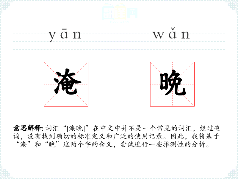 由于“淹晚”不是一个标准词汇,它在不同语境下的使用可能非常有限。如果存在,它可能出现在某些特定的地方方言或文学作品中,用以形容时间的延迟。