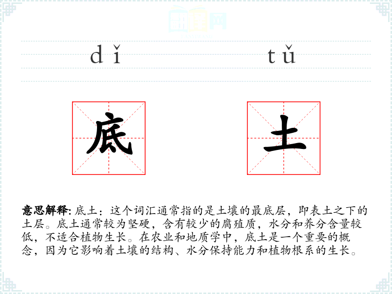 底土:这个词汇通常指的是土壤的最底层,即表土之下的土层。底土通常较为坚硬,含有较少的腐殖质,水分和养分含量较低,不适合植物生长。在农业和地质学中,底土是一个重要的概念,因为它影响着土壤的结构、水分保持能力和植物根系的生长。