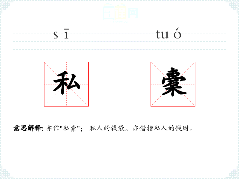 亦作"私槖"; 私人的钱袋。亦借指私人的钱财。